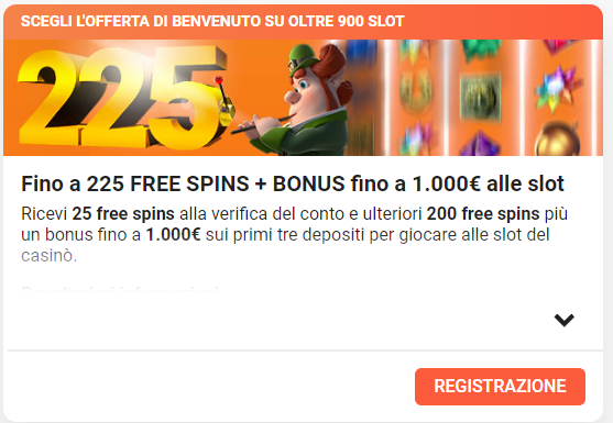 LeoVegas offre ai nuovi giocatori un nuovo Welcome Bonus davvero molto sostanzioso, ed il bello è che ogni nuovo iscritto al casinò riceve ben 25 giri gratis alle slot senza dover prima effettuare alcun deposito. Non si sà mai quando la Dea bendata possa apparire nella vita di una persona, quindi perchè non tentare la fortuna, specialmente se a costo zero? Oltre a questo, per chi desidera giocare con denaro vero e proprio, LeoVegas riserva uno dei massimi bonus attualmente offerti da casinò online italiani, che nel caso specifico può arrivare fino a 1.500 euro + un ulteriore 250 free spins gratuiti per fare davvero festa alla grande.