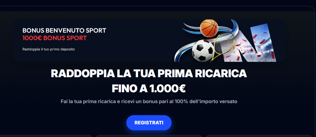 Tutt'altra offerta viene invece riservata da Netbet agli appassionati di scommesse sportive che prevede un generoso bonus di benvenuto sport del 100% fino a 1.000€ sulla prima ricarica.