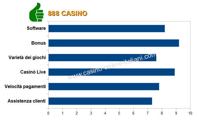 Il casinò 888 è un brand "classico" del gioco d'azzardo online legale e ciò si intravede chiaramente fin dal primo momento che si visita il sito per la prima volta. Non aspettatevi quindi effetti speciali sulla homepage per attirare l'attenzione dei più giovani, quelli li potete trovare certamente all'interno dei giochi, ma aspettatevi invece di trovare l'equivalente di un vero casinò terrestre, però via internet, specialmente se vi piacciono i giochi da tavolo. In special modo il Casinò 888 Live con croupier dal vivo.