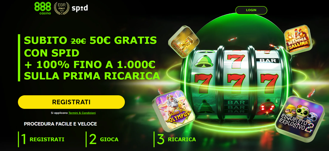 Il gioco online in modalità reale richiede ovviamente un deposito da parte del giocatore. Ma nel caso del casinò 888.it esiste attualmente un promozione per i nuovi clienti che permette di iniziare a giocare con soldi veri, ma senza effettuare alcun deposito! Infatti, sul casinò 888 si possono ricevere €50 assolutamente gratis al momento della registrazione con SPID, ma oltre a questo anche un bonus fino a €1.000 in caso si decida di depositare. Un'opportunità quasi unica nel panorama dei casinò online, e un modo di invitare i clienti a provare i giochi e servizi offerti dal sito.