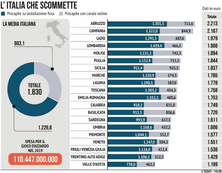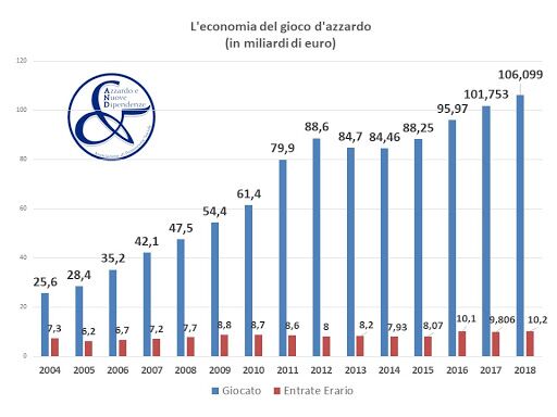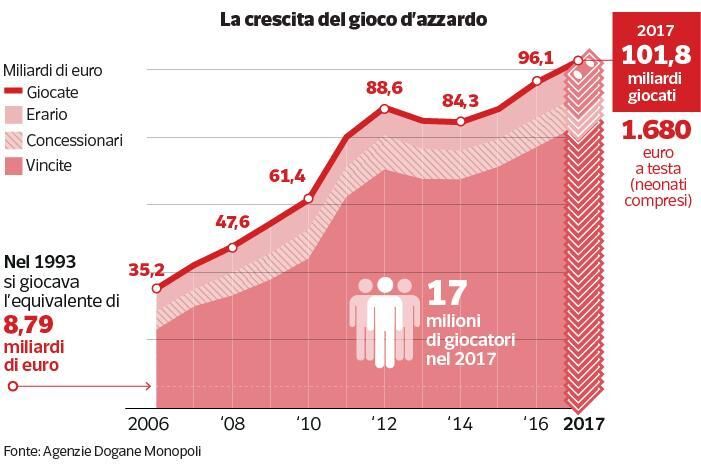 Agli italiani in particolare piace scommettere. Ad esempio, nel 2017 ci siamo giocati 101,8 miliardi, ma se contiamo che, secondo il CNR i giocatori in Italia sono 18 milioni, ognuno di loro ha speso 5988 euro. Il gioco d’azzardo non ha risentito della crisi: oggi si gioca il 20% in più rispetto agli 84,3 miliardi del 2014. Se invece si torna indietro di dieci anni la crescita è del 241,5%, e si torna al 1993, quando si giocò in un anno l’equivalente di 8,79 miliardi di euro, la crescita è del 1.158%!