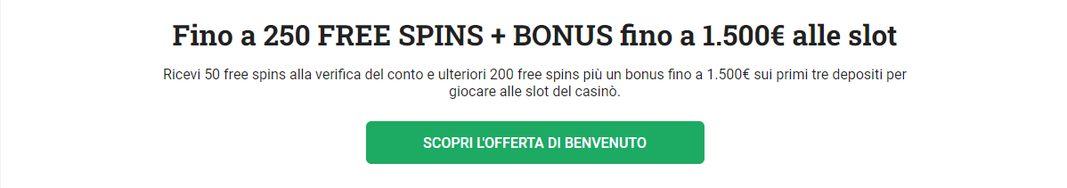 LeoVegas offre ai nuovi giocatori un nuovo Welcome Bonus davvero molto sostanzioso, ed il bello è che ogni nuovo iscritto al casinò riceve ben 25 giri gratis alle slot senza dover prima effettuare alcun deposito. Non si sà mai quando la Dea bendata possa apparire nella vita di una persona, quindi perchè non tentare la fortuna, specialmente se a costo zero? Oltre a questo, per chi desidera giocare con denaro vero e proprio, LeoVegas riserva uno dei massimi bonus attualmente offerti da casinò online italiani, che nel caso specifico può arrivare fino a 1.500 euro + un ulteriore 250 free spins gratuiti per fare davvero festa alla grande.