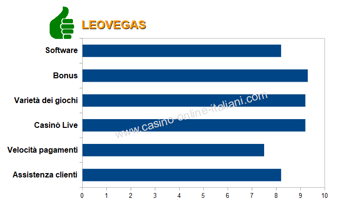LeoVegas è un moderno operatore di giochi d'azzardo online che viaggia con i tempi che viviamo e quindi in grado di "capire" il mercato, anzi di anticiparne i tempi con varie soluzioni che permettono ai giocatori di vivere un'esperienza al di sopra della mediocrità. Il management e operativi è composto da professionisti italiani che si dedicano con molta passione e serietà al lavoro che fanno, senza se e senza ma. Qui si bada al sodo e sapendo che bisogna combattere duro per affrontare la concorrenza agguerrita non hanno altra scelta, se non quella di offrire il meglio, nel rispetto delle leggi vigenti. LeoVegas è quindi un portale di gioco piacevole, sicuro ed efficiente che merita di diritto di stare nella classifica dei migliori casinò online italiani.