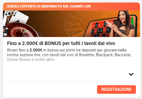Un'altra offerta più unica che rara nell'attuale panorama globale dei casinò online legali in Italia viene sempre da LeoVegas, con un nuovissimo MAXI BONUS di fino a €2.000 per i nuovi clienti che si iscrivono al Casinò Live. Se vi piace l'ebbrezza che si prova quando si gioca in un casinò terrestre, questa è davvero un'offerta imperdibile che praticamente non esiste in nessun casinò reale, ma solo online grazie ai live casino e a LeoVegas in questo caso.